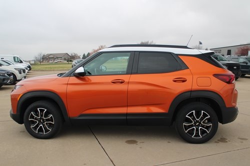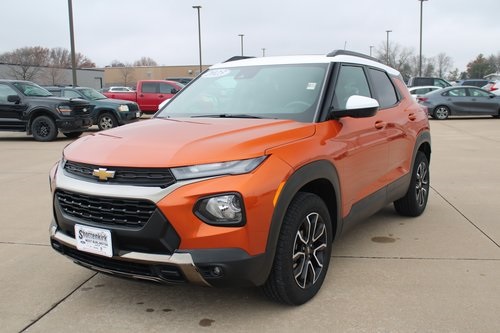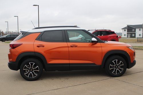 2022 Chevrolet TrailBlazer ACTIV Vivid Orange Metallic 4D Sport Utility 1.3L Ecotec Turbo DOHC SIDI w/VVT 9-Speed Automatic AWD ACTIV This vehicle comes well equipped with Convenience Package (1 Type-A & 1 Type-C USB Charging-Only Ports, 120-Volt Power Outlet, 8" Diagonal Color Touchscreen Display, Cabin Humidity Sensor, Driver & Front Passenger Illuminated Vanity Mirrors, Inside Rear-View Auto-Dimming Mirror, and Single-Zone Auto Climate Control Air Conditioning), Driver Confidence Package (Lane Change Alert w/Side Blind Zone Alert, Rear Cross Traffic Alert, and Rear Park Assist), Preferred Equipment Group 1SA (Heated Steering Wheel), Sun & Liftgate Package (Dual-Pane Panoramic Power Sunroof and Hands-Free Power Programmable Liftgate), Technology Package (4.2" Diagonal Multi-Color Driver Info Center, Adaptive Cruise Control, Bose Premium 7-Speaker Audio System Feature, HD Radio, HD Rear Vision Camera, LED Headlamps, Memory Card Receptacle, Radio: Chevrolet Infotainment 3 Plus System, SiriusXM w/360L, and Wireless Charging), 2-Way Power Driver Lumbar Seat Adjuster, 3.17 Axle Ratio, 4-Way Manual Front Passenger Seat Adjuster, 4-Wheel Disc Brakes, 6 Speakers, 6-Speaker Audio System Feature w/Amplifier, 8-Way Power Driver Seat Adjuster, ABS brakes, Air Conditioning, Alloy wheels, AM/FM radio: SiriusXM, Auto High-beam Headlights, Brake assist, Bumpers: body-color, Compass, Delay-off headlights, Driver door bin, Driver vanity mirror, Dual front impact airbags, Dual front side impact airbags, Electronic Stability Control, Emergency communication system: OnStar and Chevrolet connected services capable, Exterior Parking Camera Rear, Flat-Folding Front Passenger Seatback, Front anti-roll bar, Front Bucket Seats, Front Center Armrest, Front fog lights, Front License Plate Bracket, Front reading lights, Front wheel independent suspension, Fully automatic headlights, Heated door mirrors, Heated Driver & Front Passenger Seats, Heated front seats, Heated steering wheel, Illuminated entry, Knee airbag, Leather Shift Knob, Leather steering wheel, Leatherette Seat Trim, Low tire pressure warning, Not Equipped w/Driver & Fr Passenger Heated Seats, Not Equipped w/Rear Park Assist, Occupant sensing airbag, Overhead airbag, Overhead console, Panic alarm, Passenger door bin, Passenger vanity mirror, Power door mirrors, Power driver seat, Power steering, Power windows, Radio data system, Radio: Chevrolet Infotainment 3 System, Rear seat center armrest, Rear side impact airbag, Rear window defroster, Rear window wiper, Remote keyless entry, Ride & Handling Suspension, Roof rack: rails only, Security system, SiriusXM Radio, Speed control, Split folding rear seat, Spoiler, Steering wheel mounted audio controls, Summit White Two-Tone Roof, Tachometer, Telescoping steering wheel, Tilt steering wheel, Traction control, Trip computer, Variably intermittent wipers, Wheels: 17" High Gloss Black Machined Aluminum, and Wireless Apple CarPlay/Android Auto.