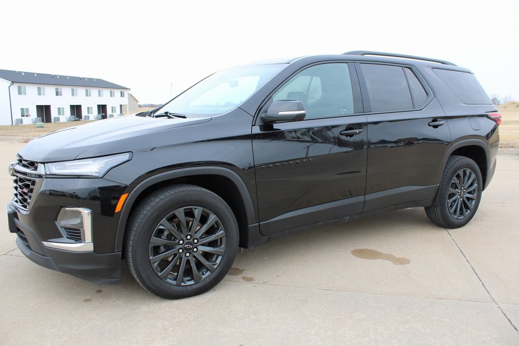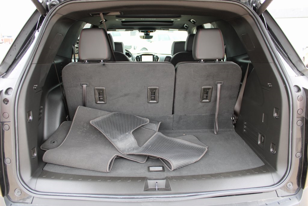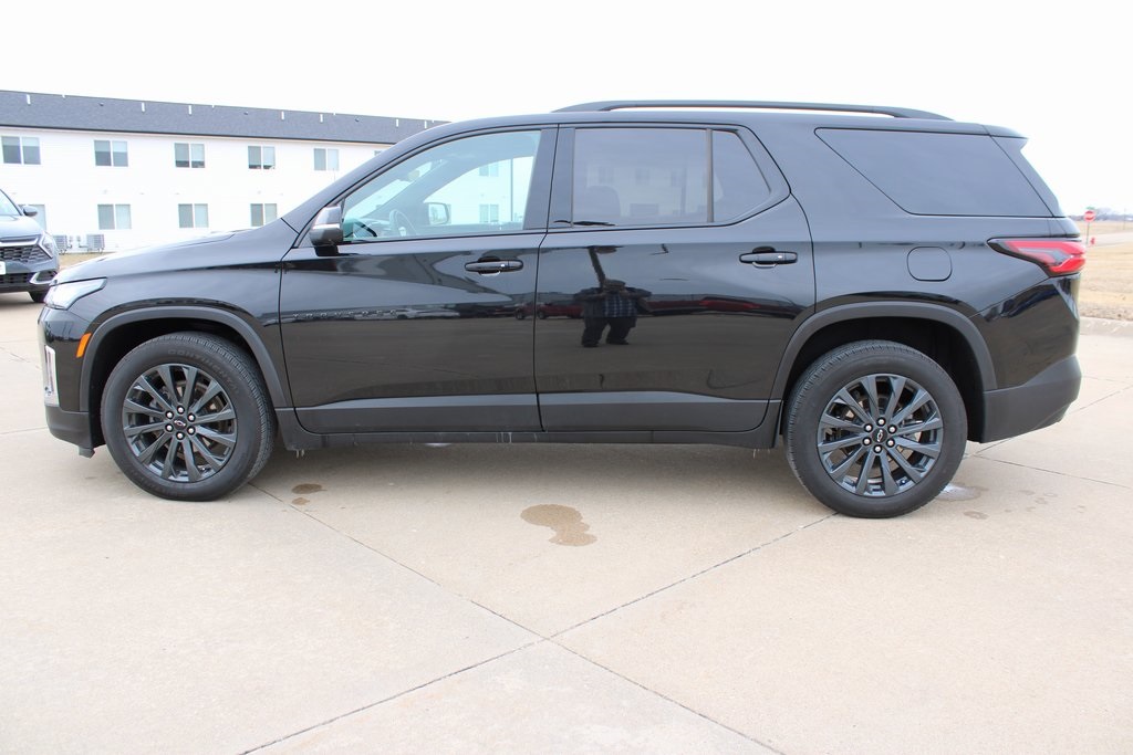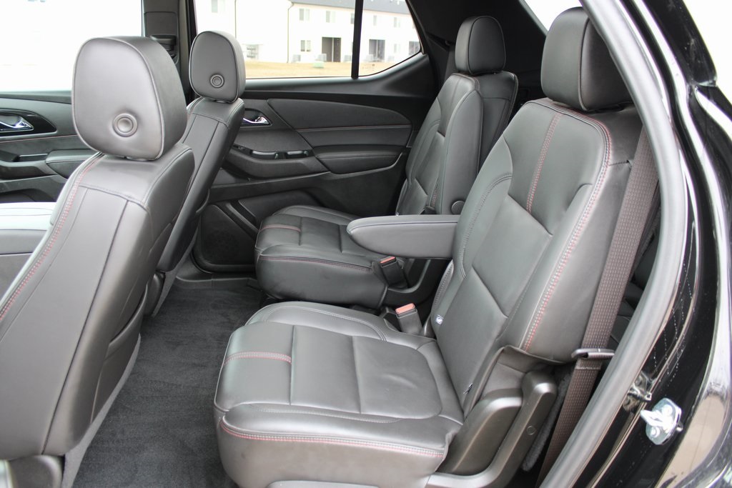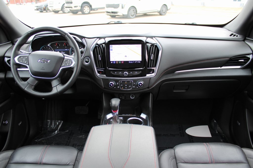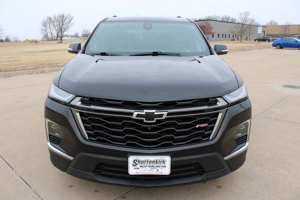 2023 Chevrolet Traverse RS Mosaic Black Metallic 4D Sport Utility 3.6L V6 SIDI VVT 9-Speed Automatic AWD RS This vehicle comes well equipped with Front License Plate Bracket Mounting Package, Preferred Equipment Group 2LT (Heated Driver & Front Passenger Seats), 10 Speakers, 3.49 Axle Ratio, 3rd row seats: split-bench, 4-Wheel Disc Brakes, 6-Way Power Front Passenger Seat, 8-Way Power Driver Seat Adjuster, ABS brakes, Air Conditioning, Alloy wheels, AM/FM radio: SiriusXM with 360L, Apple CarPlay/Android Auto, Auto High-beam Headlights, Auto-dimming Rear-View mirror, Automatic temperature control, Bose Premium 10-Speaker Audio System Feature, Brake assist, Bumpers: body-color, Compass, Delay-off headlights, Driver door bin, Driver vanity mirror, Dual front impact airbags, Dual front side impact airbags, Dual SkyScape 2-Panel Power Sunroof, Electronic Stability Control, Emergency communication system, Exterior Parking Camera Rear, Four wheel independent suspension, Front anti-roll bar, Front Bucket Seats, Front Center Armrest, Front dual zone A/C, Front Passenger 2-Way Power Lumbar, Front reading lights, Fully automatic headlights, Garage door transmitter, Heated door mirrors, Heated front seats, Heated steering wheel, Illuminated entry, Leather steering wheel, Low tire pressure warning, Navigation System, Not Equipped w/Rear Park Assist (060), Occupant sensing airbag, Outside temperature display, Overhead airbag, Overhead console, Panic alarm, Passenger door bin, Passenger vanity mirror, Perforated Leather-Appointed Seat Trim, Power door mirrors, Power Driver Lumbar Control, Power driver seat, Power Liftgate, Power passenger seat, Power steering, Power windows, Premium audio system: Chevrolet Infotainment 3 Plus, Radio data system, Radio: Chevrolet Infotainment 3 Plus System w/Navi, Rear air conditioning, Rear anti-roll bar, Rear reading lights, Rear window defroster, Rear window wiper, Remote keyless entry, Security system, SiriusXM w/360L, Speed control, Speed-sensing steering, Spoiler, Steering wheel mounted audio controls, Tachometer, Telescoping steering wheel, Tilt steering wheel, Traction control, Trip computer, Turn signal indicator mirrors, Variably intermittent wipers, Voltmeter, and Wheels: 20" Dark Aluminum.