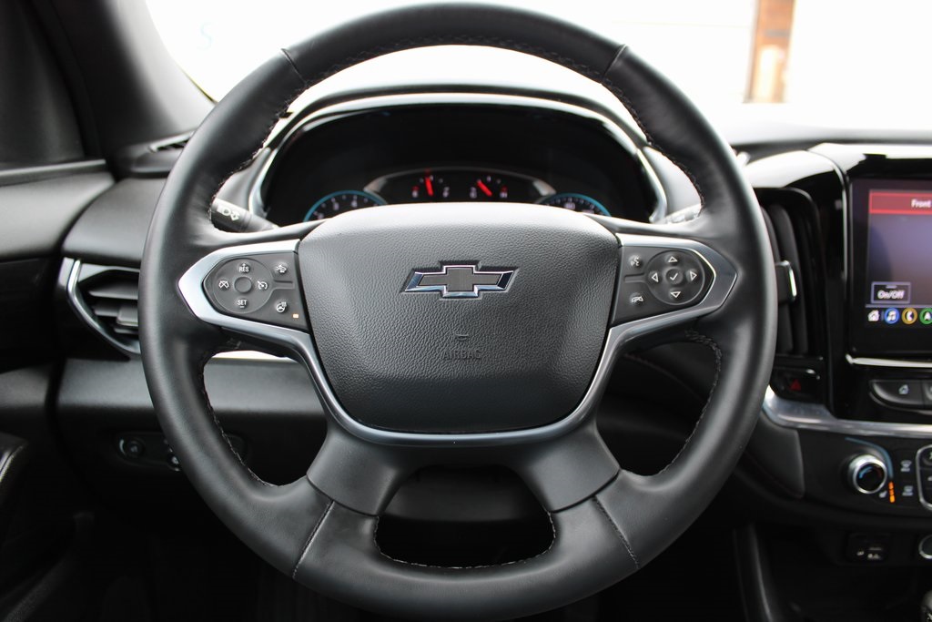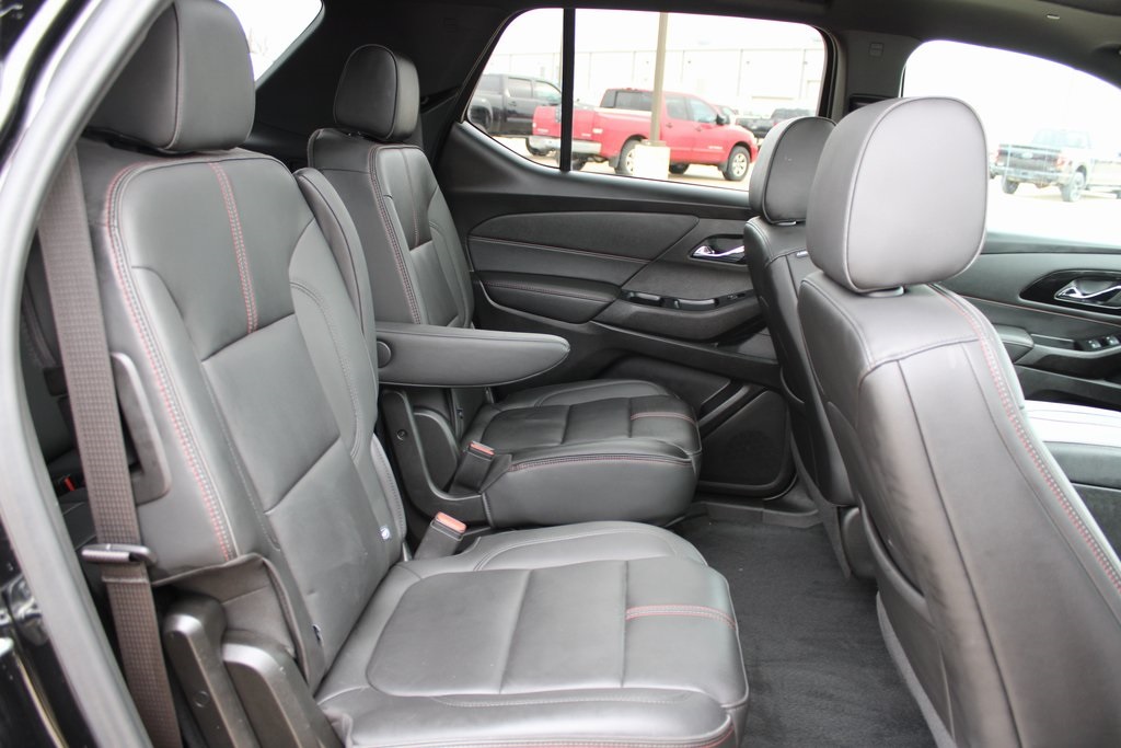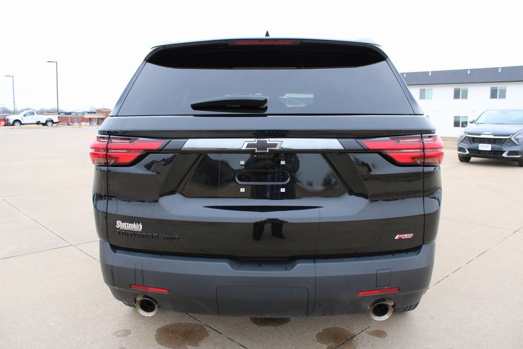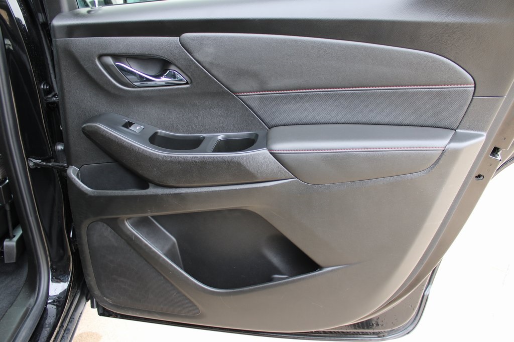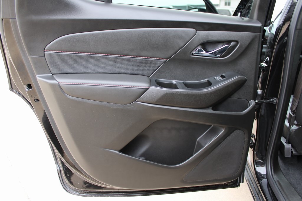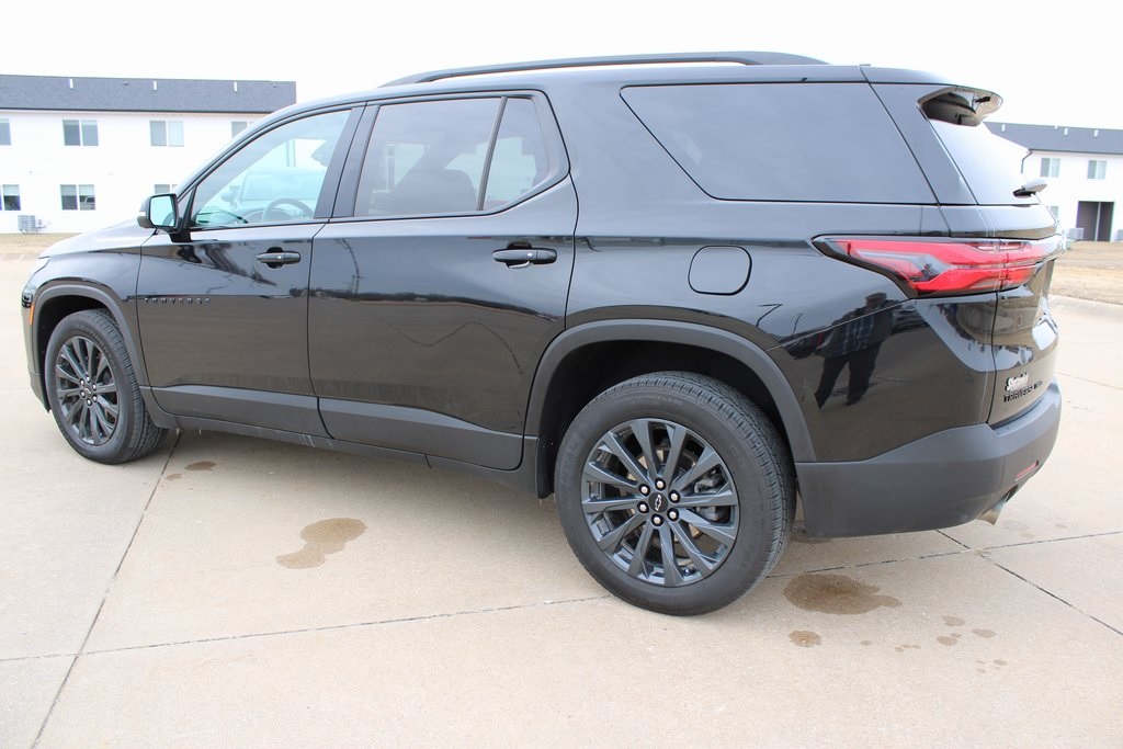 2023 Chevrolet Traverse RS Mosaic Black Metallic 4D Sport Utility 3.6L V6 SIDI VVT 9-Speed Automatic AWD RS This vehicle comes well equipped with Front License Plate Bracket Mounting Package, Preferred Equipment Group 2LT (Heated Driver & Front Passenger Seats), 10 Speakers, 3.49 Axle Ratio, 3rd row seats: split-bench, 4-Wheel Disc Brakes, 6-Way Power Front Passenger Seat, 8-Way Power Driver Seat Adjuster, ABS brakes, Air Conditioning, Alloy wheels, AM/FM radio: SiriusXM with 360L, Apple CarPlay/Android Auto, Auto High-beam Headlights, Auto-dimming Rear-View mirror, Automatic temperature control, Bose Premium 10-Speaker Audio System Feature, Brake assist, Bumpers: body-color, Compass, Delay-off headlights, Driver door bin, Driver vanity mirror, Dual front impact airbags, Dual front side impact airbags, Dual SkyScape 2-Panel Power Sunroof, Electronic Stability Control, Emergency communication system, Exterior Parking Camera Rear, Four wheel independent suspension, Front anti-roll bar, Front Bucket Seats, Front Center Armrest, Front dual zone A/C, Front Passenger 2-Way Power Lumbar, Front reading lights, Fully automatic headlights, Garage door transmitter, Heated door mirrors, Heated front seats, Heated steering wheel, Illuminated entry, Leather steering wheel, Low tire pressure warning, Navigation System, Not Equipped w/Rear Park Assist (060), Occupant sensing airbag, Outside temperature display, Overhead airbag, Overhead console, Panic alarm, Passenger door bin, Passenger vanity mirror, Perforated Leather-Appointed Seat Trim, Power door mirrors, Power Driver Lumbar Control, Power driver seat, Power Liftgate, Power passenger seat, Power steering, Power windows, Premium audio system: Chevrolet Infotainment 3 Plus, Radio data system, Radio: Chevrolet Infotainment 3 Plus System w/Navi, Rear air conditioning, Rear anti-roll bar, Rear reading lights, Rear window defroster, Rear window wiper, Remote keyless entry, Security system, SiriusXM w/360L, Speed control, Speed-sensing steering, Spoiler, Steering wheel mounted audio controls, Tachometer, Telescoping steering wheel, Tilt steering wheel, Traction control, Trip computer, Turn signal indicator mirrors, Variably intermittent wipers, Voltmeter, and Wheels: 20" Dark Aluminum.