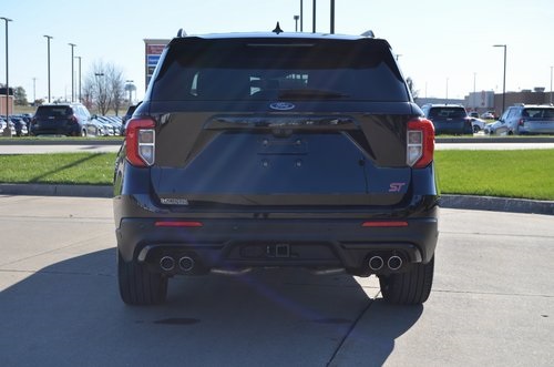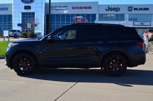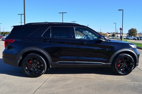 2023 Ford Explorer ST Agate Black Metallic 4D Sport Utility 3.0L EcoBoost V6 10-Speed Automatic 4WD ST This vehicle comes well equipped with Equipment Group 401A, Ford Co-Pilot360 Assist+ (Evasive Steering Assist, Intelligent Adaptive Cruise Control, Speed Sign Recognition, and Voice-Activated Touchscreen Navigation System), ST High Package (110V/150W AC Power Outlet, 360-Degree Camera w/Split View, Auto-Dimming Rearview Mirror (Interior), Front Parking Sensors, Front Rain-Sensing Wipers, Memory Driver's Seat, Power Tilt/Telescoping Steering Column, Radio: B&O Sound System by Bang & Olufsen, Reverse Brake Assist, Second Row Heated Seats, Sideview Mirrors w/Gloss Black Caps, Third Row PowerFold (Folds Flat), Universal Garage Door Opener (UGDO), and Wireless Charging Pad), ST Street Pack (Performance Front & Rear Brakes and Wheels: 21" Aluminum), Technology Package (10.1" LCD Capacitive Portrait Touchscreen and 2 Additional Speakers), 20" Machined Aluminum w/Painted Pockets Wheels, 3.58 Non-Limited-Slip Rear Axle Ratio, 3rd row seats: bench, 4-Wheel Disc Brakes, 4G LTE Wi-Fi Hotspot Credit, 6 Speakers, ABS brakes, Active Park Assist 2.0, Air Conditioning, Alloy wheels, AM/FM radio: SiriusXM, AM/FM Stereo, Auto High-beam Headlights, Automatic temperature control, Brake assist, Bumpers: body-color, Compass, Delay-off headlights, Driver door bin, Driver vanity mirror, Dual front impact airbags, Dual front side impact airbags, Electronic Stability Control, Emergency communication system: SYNC 3 911 Assist, Exterior Parking Camera Rear, FordPass Connect, Four wheel independent suspension, Front anti-roll bar, Front Bucket Seats, Front Center Armrest, Front dual zone A/C, Front fog lights, Front reading lights, Fully automatic headlights, Heated door mirrors, Heated front seats, Heated steering wheel, Illuminated entry, Knee airbag, Leather Htd/Ventilated Sport Captain's Chairs, Leather steering wheel, Low tire pressure warning, Memory seat, Occupant sensing airbag, Outside temperature display, Overhead airbag, Overhead console, Panic alarm, Passenger door bin, Passenger vanity mirror, Power door mirrors, Power driver seat, Power Liftgate, Power passenger seat, Power steering, Power windows, Rear air conditioning, Rear anti-roll bar, Rear reading lights, Rear window defroster, Rear window wiper, Remote keyless entry, Security system, SelectShift Capability w/Paddle Shifters, Speed control, Speed-sensing steering, Speed-Sensitive Wipers, Split folding rear seat, Spoiler, Sport steering wheel, Steering wheel mounted audio controls, SYNC 3 Communications & Entertainment System, SYNC 3/Apple CarPlay/Android Auto, Tachometer, Telescoping steering wheel, Tilt steering wheel, Traction control, Trip computer, Twin Panel Moonroof, Variably intermittent wipers, and Ventilated front seats.