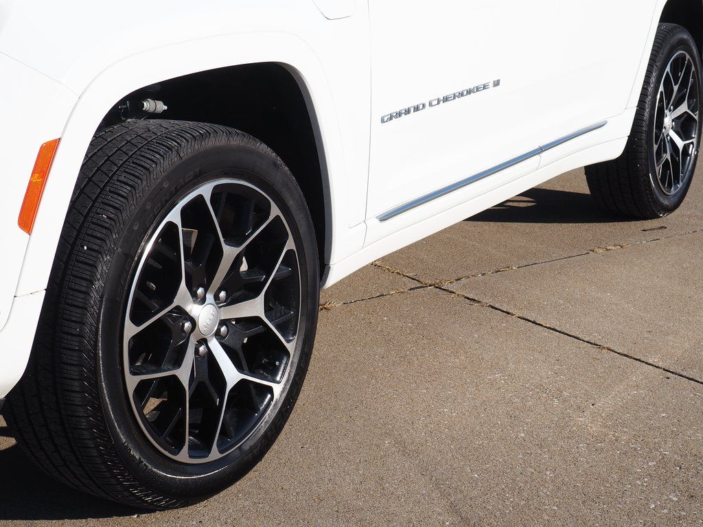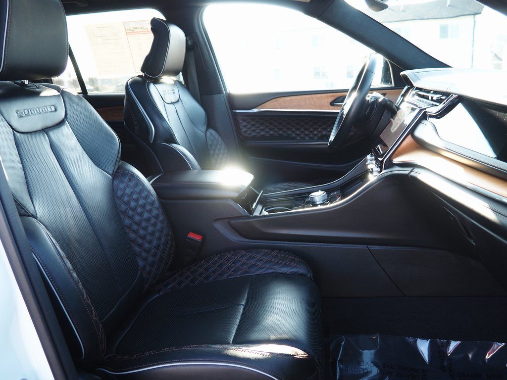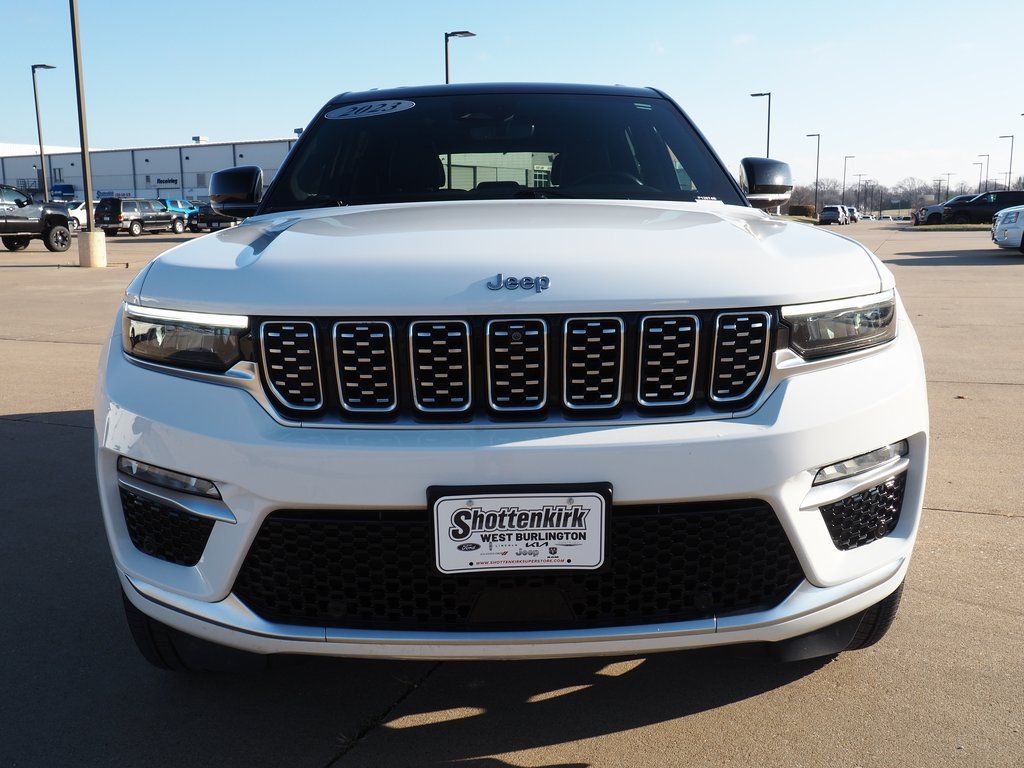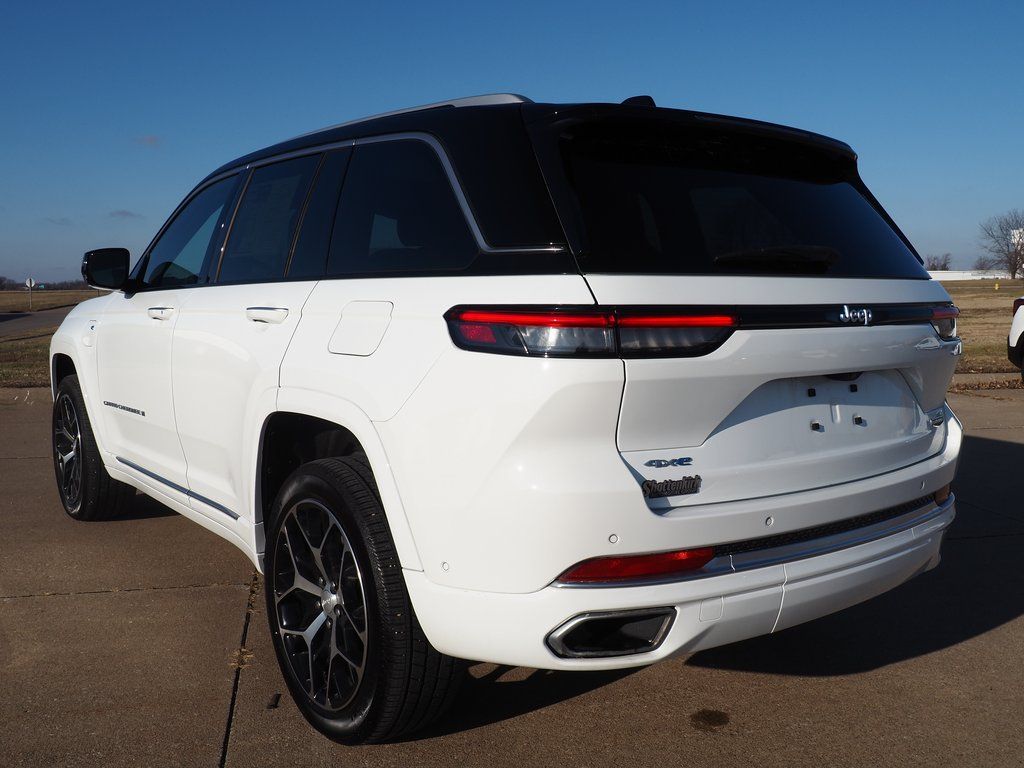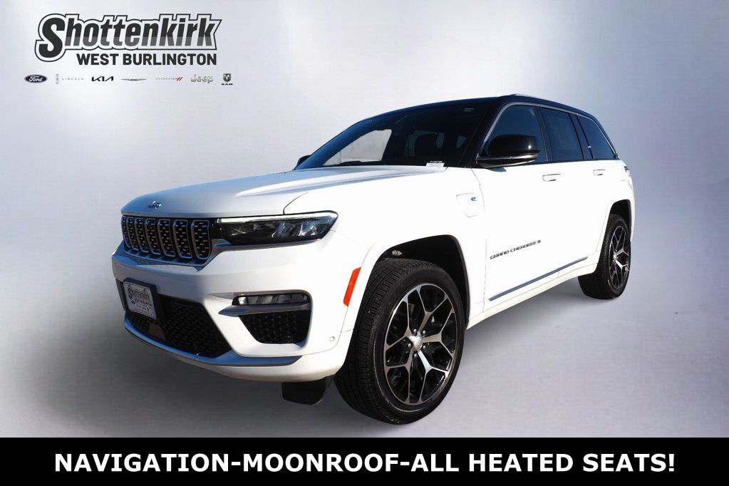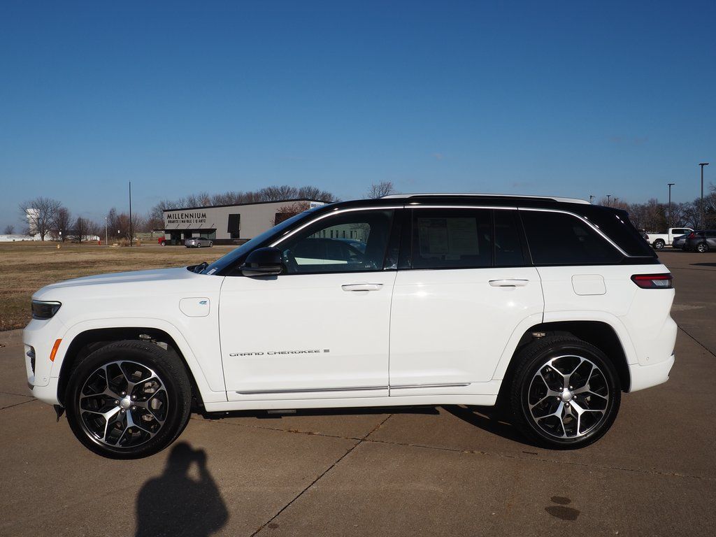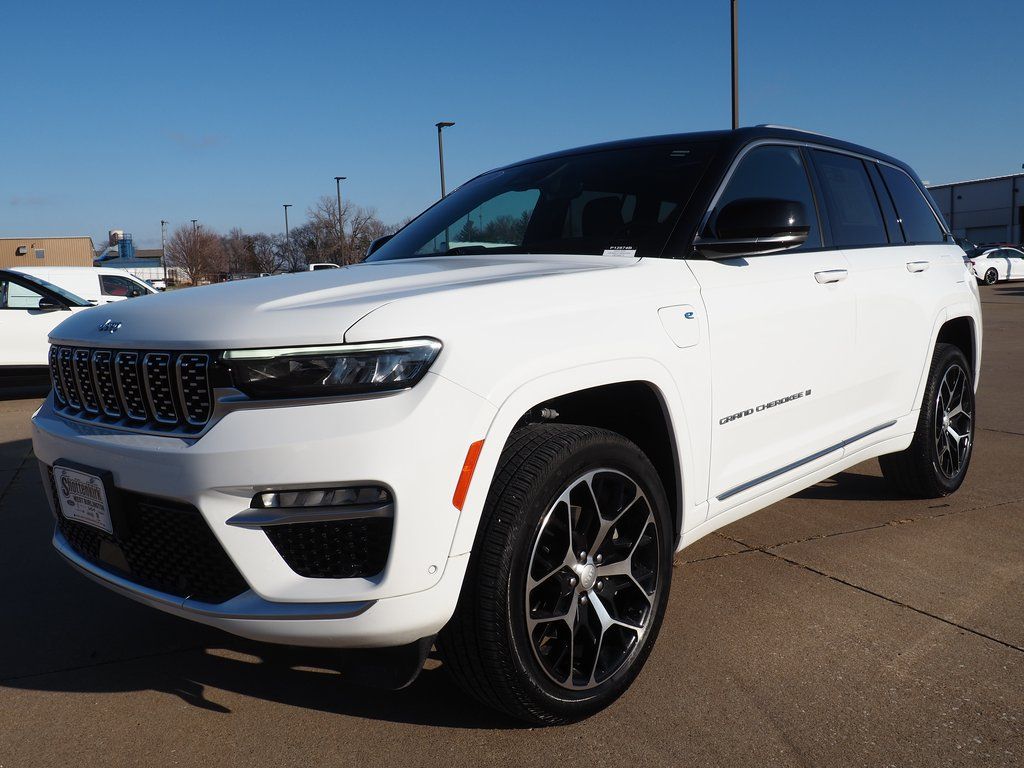 2023 Jeep Grand Cherokee Summit Reserve 4xe Bright White Clearcoat 4D Sport Utility 2.0L I4 DOHC 8-Speed Automatic 4WD Summit Reserve 4xe This vehicle comes well equipped with Quick Order Package 27U Summit Reserve (Deluxe Headliner, Palermo Leather Door Trim, Palermo Leather Seats, Summit Reserve, Summit Reserve Badge, Ventilated Rear Seats, and Wheels: 21" x 9" Machined Face/Painted Aluminum), Two Tone Paint Group, 19 Speakers, 3.70 Rear Axle Ratio, 4-Wheel Disc Brakes, ABS brakes, Adaptive suspension, Air Conditioning, Alloy wheels, AM/FM radio: SiriusXM with 360L, Anti-whiplash front head restraints, Audio memory, Auto High-beam Headlights, Auto-dimming door mirrors, Auto-dimming Rear-View mirror, Auto-leveling suspension, Automatic temperature control, Brake assist, Bumpers: body-color, Compass, Delay-off headlights, Driver door bin, Driver vanity mirror, Dual front impact airbags, Dual front side impact airbags, Electronic Stability Control, Four wheel independent suspension, Front anti-roll bar, Front Bucket Seats, Front Center Armrest w/Storage, Front dual zone A/C, Front fog lights, Front License Plate Bracket, Front reading lights, Fully automatic headlights, Garage door transmitter, Genuine wood dashboard insert, Genuine wood door panel insert, Heated door mirrors, Heated front seats, Heated rear seats, Heated steering wheel, Heavy Duty Suspension, Illuminated entry, Knee airbag, Leather steering wheel, Low tire pressure warning, Memory seat, Nappa Leather Seats, Navigation System, Occupant sensing airbag, Outside temperature display, Overhead airbag, Overhead console, Panic alarm, Passenger door bin, Passenger vanity mirror, Power door mirrors, Power driver seat, Power Liftgate, Power moonroof, Power passenger seat, Power steering, Power windows, Radio data system, Radio: Uconnect 5 Nav w/10.1" Display, Rain sensing wipers, Rear air conditioning, Rear anti-roll bar, Rear dual zone A/C, Rear reading lights, Rear seat center armrest, Rear window defroster, Rear window wiper, Remote keyless entry, Security system, Speed control, Speed-Sensitive Wipers, Split folding rear seat, Spoiler, Steering wheel memory, Steering wheel mounted audio controls, Tachometer, Telescoping steering wheel, Tilt steering wheel, Traction control, Trip computer, Turn signal indicator mirrors, Variably intermittent wipers, Ventilated front seats, Voltmeter, and Wheels: 20" x 8.5" Fully Painted Aluminum Silver.
