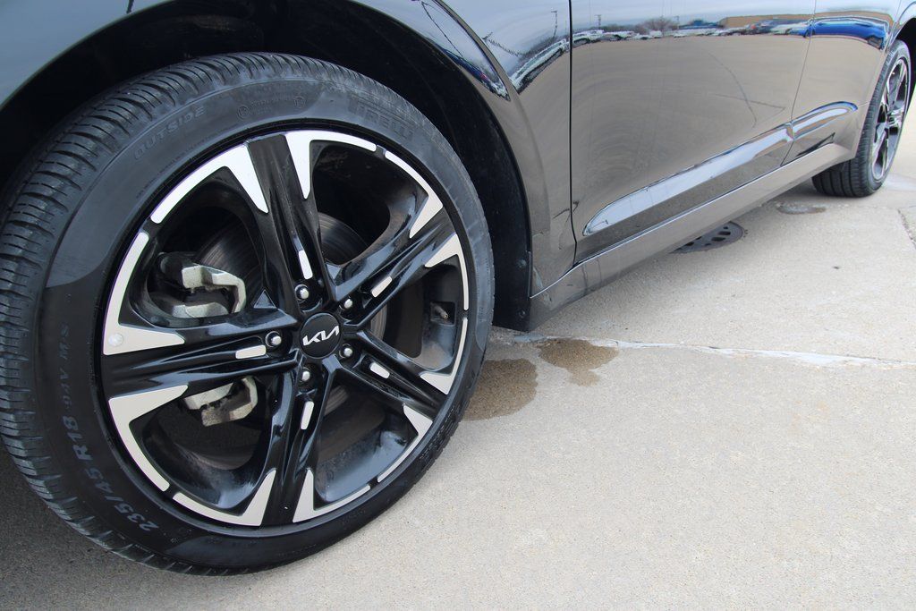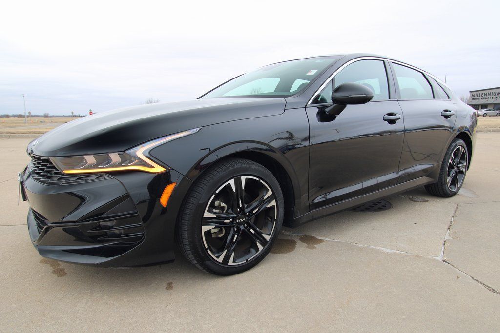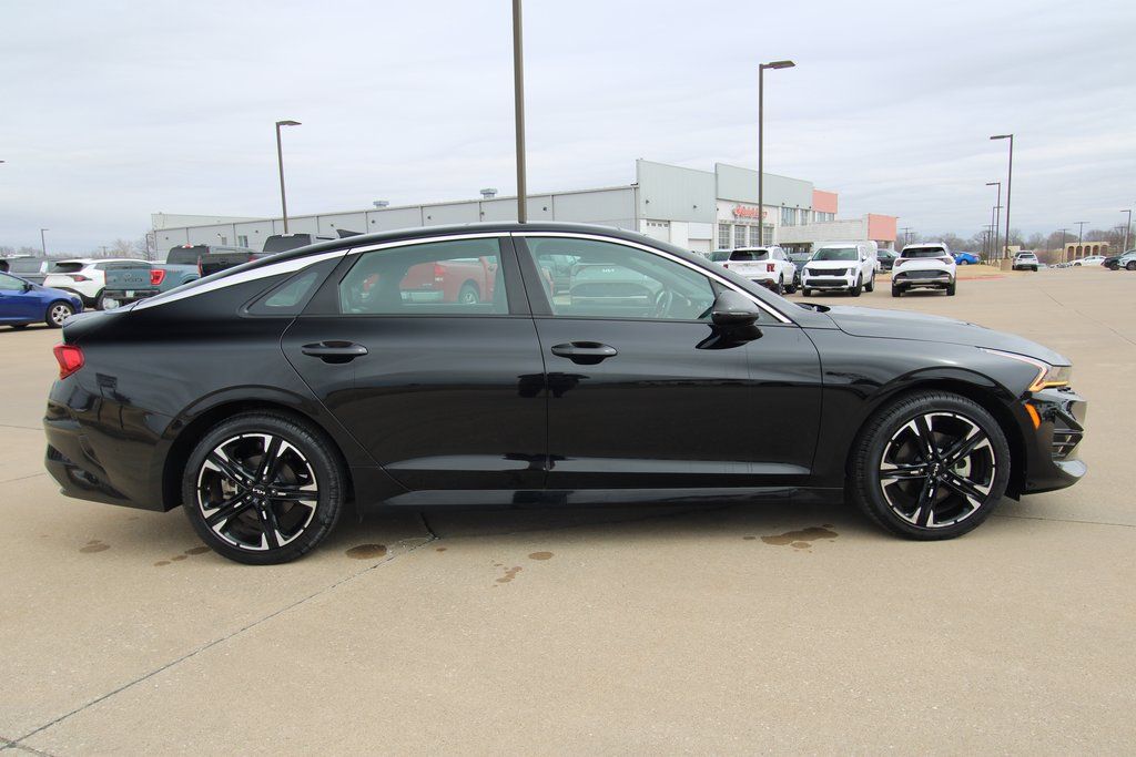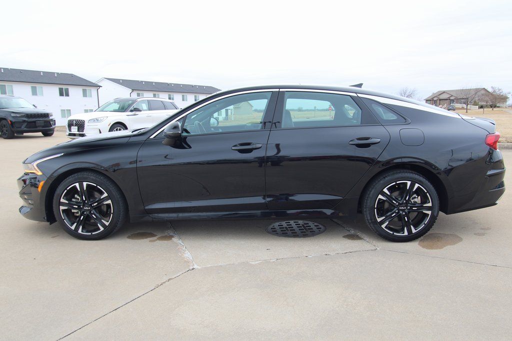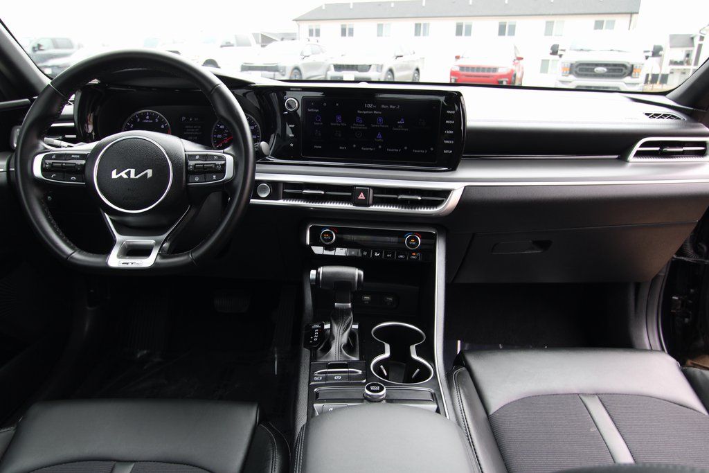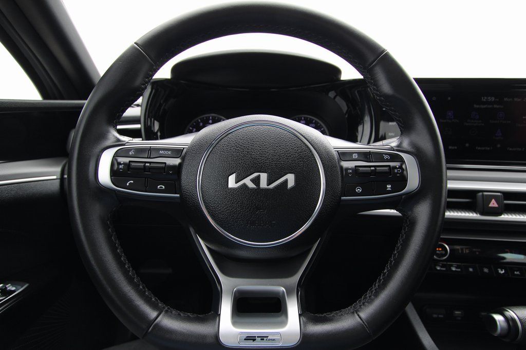 2023 Kia K5 GT-Line Ebony Black 4D Sedan 1.6L I4 DGI Turbocharged DOHC 16V LEV3-ULEV70 180hp 8-Speed Automatic FWD GT-Line This vehicle comes well equipped with GT-Line Panoramic Sunroof Package (LED Interior Lighting and Panoramic Sunroof), GT-Line Premium Package (Forward Collision Avoidance-Assist, Highway Driving Assist, LED Projection Headlamps, and Smart Cruise Control w/Stop & Go), 4-Wheel Disc Brakes, 6 Speakers, ABS brakes, Air Conditioning, Alloy wheels, AM/FM radio: SiriusXM, Apple CarPlay & Android Auto, Auto High-beam Headlights, Automatic temperature control, Brake assist, Bumpers: body-color, Carpeted Floor Mats, Cloth/SynTex Seat Trim, Delay-off headlights, Driver door bin, Driver vanity mirror, Dual front impact airbags, Dual front side impact airbags, EC Mirror w/Homelink, Electronic Stability Control, Four wheel independent suspension, Front anti-roll bar, Front Bucket Seats, Front Center Armrest, Front dual zone A/C, Front fog lights, Front reading lights, Fully automatic headlights, Heated door mirrors, Illuminated entry, Knee airbag, Low tire pressure warning, Navigation System, Occupant sensing airbag, Outside temperature display, Overhead airbag, Overhead console, Panic alarm, Passenger door bin, Passenger vanity mirror, Power door mirrors, Power driver seat, Power steering, Power windows, Radio data system, Radio: AM/FM/MP3 Audio System, Rear anti-roll bar, Rear Bumper Applique, Rear seat center armrest, Rear side impact airbag, Rear window defroster, Remote keyless entry, Security system, Speed control, Speed-sensing steering, Split folding rear seat, Spoiler, Sport steering wheel, Steering wheel mounted audio controls, Tachometer, Telescoping steering wheel, Tilt steering wheel, Traction control, Trip computer, Turn signal indicator mirrors, Variably intermittent wipers, and Wheels: 18" Gloss Black Machined Finish Alloy.