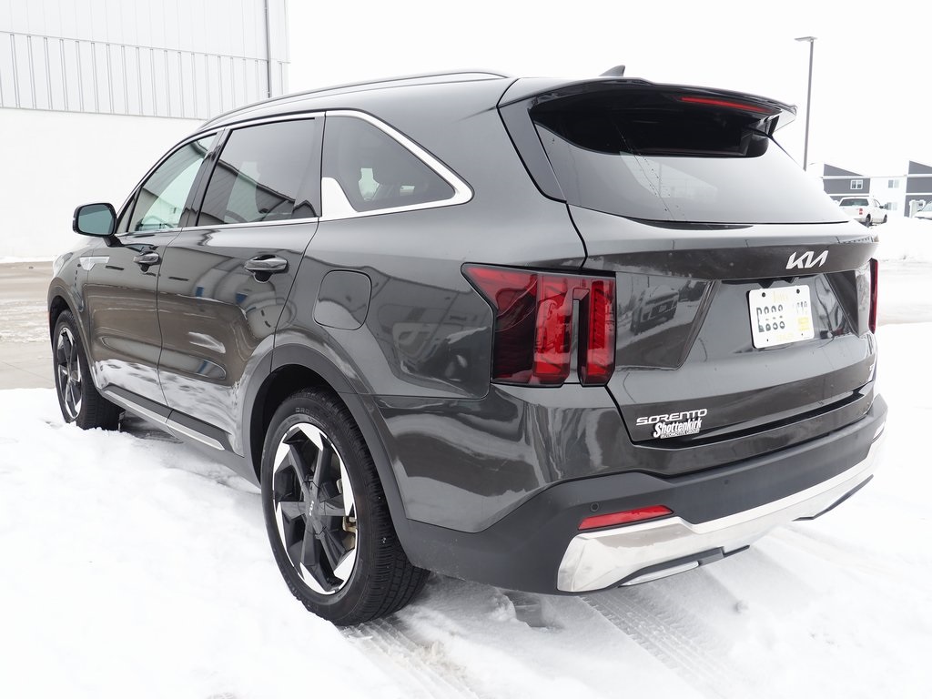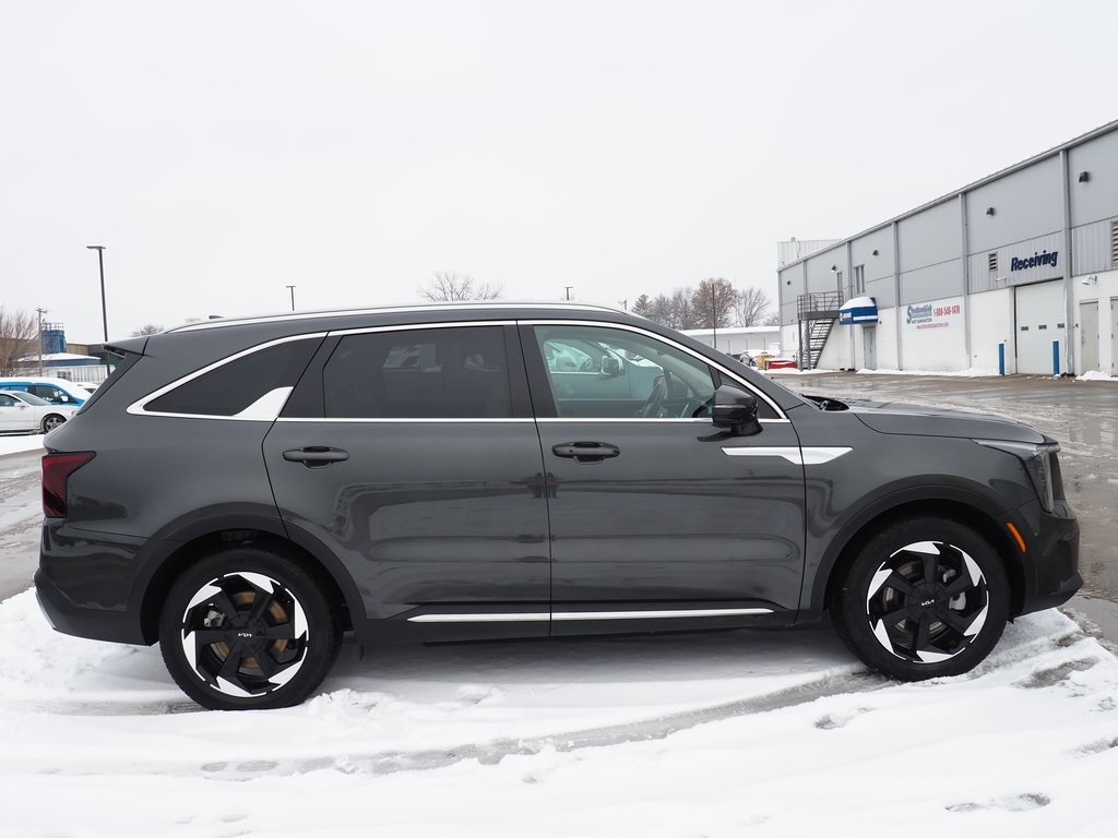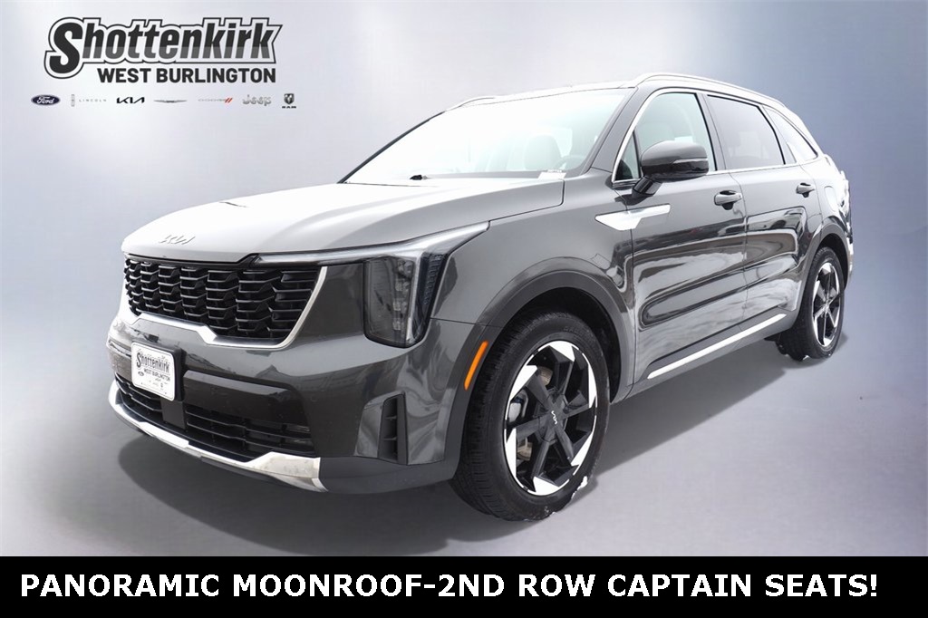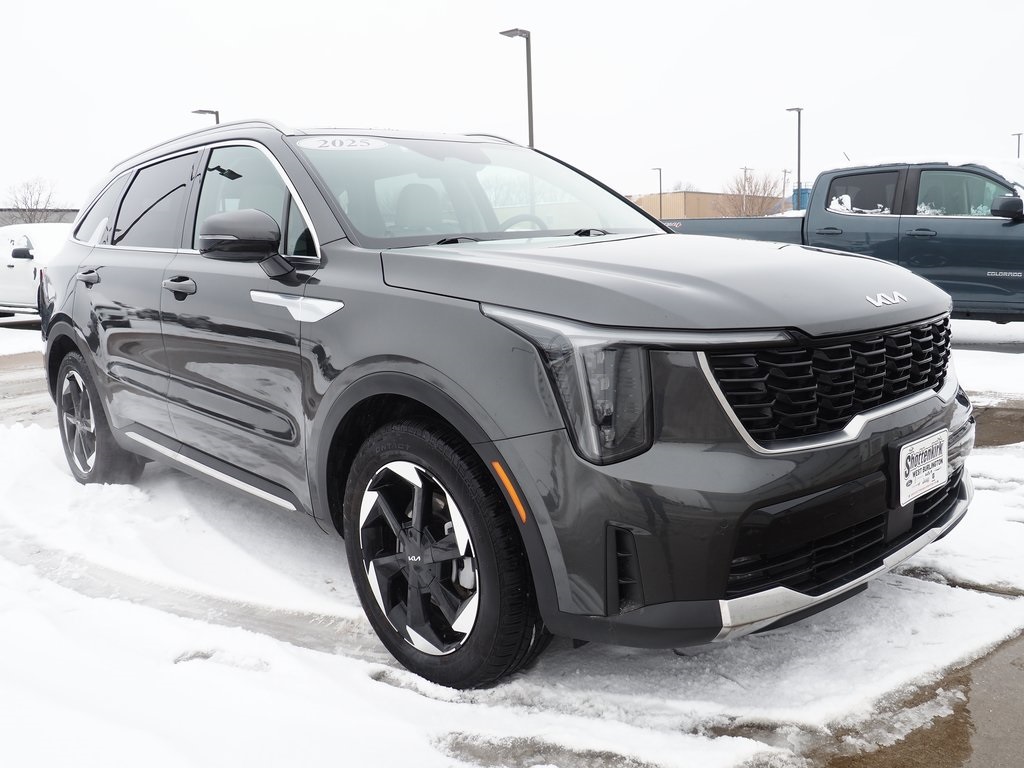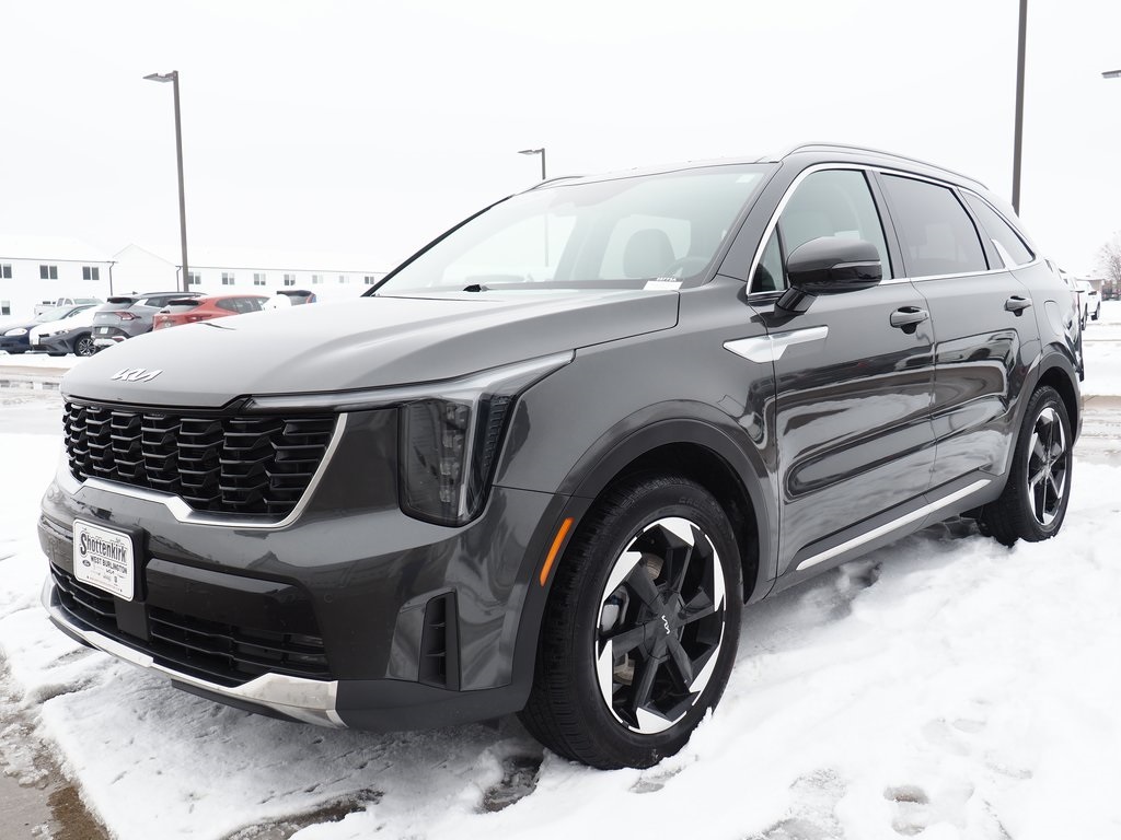 2025 Kia Sorento Hybrid EX Interstellar Gray 4D Sport Utility 1.6L Turbo GDI 4-Cylinder 6-Speed Automatic AWD EX This vehicle comes well equipped with EX Panoramic Sunroof Package (LED Interior Lighting and Power Sunroof w/Power Sunshade), 3rd row seats: split-bench, 4-Wheel Disc Brakes, 6 Speakers, ABS brakes, Air Conditioning, Alloy wheels, AM/FM radio: SiriusXM, Apple CarPlay & Android Auto, Auto High-beam Headlights, Automatic temperature control, Brake assist, Bumpers: body-color, Carpeted Floor Mats, Delay-off headlights, Driver door bin, Driver vanity mirror, Dual front impact airbags, Dual front side impact airbags, Electronic Stability Control, Emergency communication system: 911 Connect, Exterior Parking Camera Rear, Four wheel independent suspension, Front anti-roll bar, Front Bucket Seats, Front Center Armrest, Front dual zone A/C, Front fog lights, Front reading lights, Fully automatic headlights, Heated door mirrors, Heated Front Bucket Seats, Heated front seats, Illuminated entry, Knee airbag, Leather steering wheel, Low tire pressure warning, Navigation System, Occupant sensing airbag, Outside temperature display, Overhead airbag, Overhead console, Panic alarm, Passenger door bin, Passenger vanity mirror, Power door mirrors, Power driver seat, Power Liftgate, Power passenger seat, Power steering, Power windows, Radio data system, Radio: AM/FM/SiriusXM Audio System, Rear air conditioning, Rear anti-roll bar, Rear reading lights, Rear window defroster, Rear window wiper, Remote keyless entry, Security system, Speed control, Speed-sensing steering, Split folding rear seat, Spoiler, Steering wheel mounted audio controls, SynTex Artificial Leather Seat Trim, Tachometer, Telescoping steering wheel, Tilt steering wheel, Traction control, Trip computer, Turn signal indicator mirrors, Variably intermittent wipers, and Wheels: 19" Machine-Finished Aero Alloy.